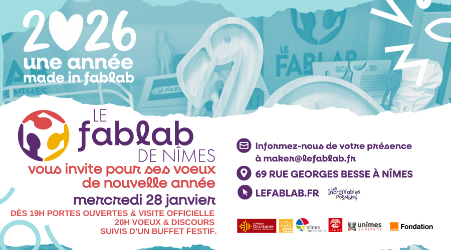 Le FabLab de Nîmes est géré et animé par l’association Les Incroyables Possibles, en partenariat avec Nîmes Métropole, et le soutien de la Région Occitanie.